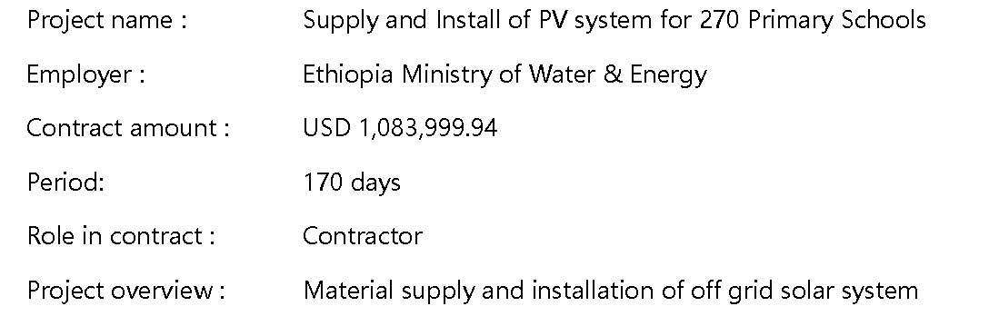 প্রকল্পটি ২০১১ সালে বিশ্বব্যাংকের জন্য অর্থ সরবরাহ করেছিল এবং ইথিওপীয় সরকার ২0০ টি প্রত্যন্ত বিদ্যালয়ে ২0০ টি ফটোভোলটাইক বিদ্যুৎ উত্পাদন ব্যবস্থা সরবরাহ করেছিল। প্রকল্পটির লক্ষ্য ইথিওপিয়ায় গ্রামীণ সম্প্রদায়ের পুনর্নবীকরণযোগ্য শক্তির বিকাশ, আমদানিকৃত জ্বালানীর উপর দেশের নির্ভরতা হ্রাস করা এবং গ্রিনহাউসগুলি হ্রাস করা। গ্যাস নির্গমন। আমাদের সংস্থা নির্দিষ্ট সময়ের মধ্যে সমস্ত সিস্টেমের ইনস্টলেশন ও কমিশন সফলভাবে সম্পন্ন করেছে এবং মালিকদের কাছ থেকে সর্বসম্মত প্রশংসা জিতেছে।